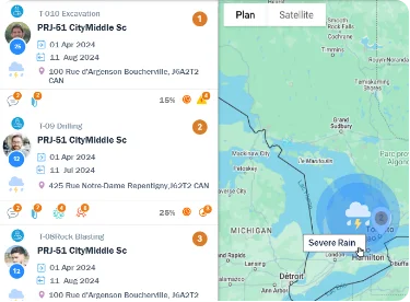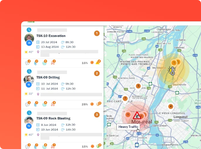 Suivez l’avancement en temps réel, gérez les mises à jour et anticipez les problèmes avant qu’ils ne s’aggravent grâce aux modules Gestion des tâches, Projet & Chantier, Rapports quotidiens et Jumeaux numériques. Les alertes et analyses prédictives pilotées par l’IA optimisent les plannings, les ressources et les opérations sur site.